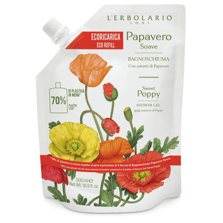 *70% di plastica in meno rispetto al peso equivalente di 2 flaconi di Bagnoschiuma Papavero Soave