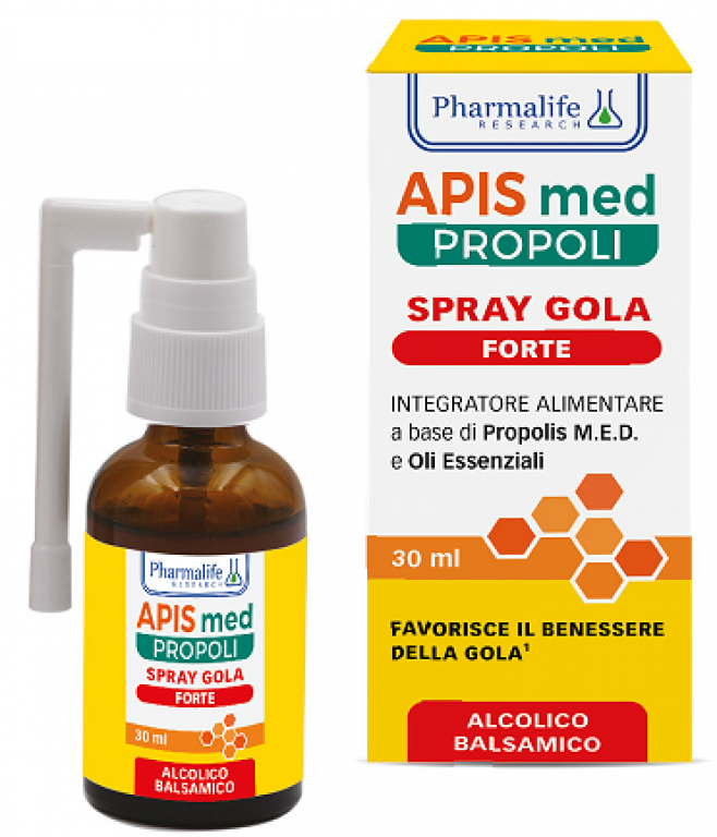 Apis Med Propoli Spray Gola Forte è un integratore alimentare in spray contenente Propoli ed oli essenziali di Menta, Timo e Salvia utile per supportare la funzionalità delle prime vie respiratorie. La propoli impiegata è ottenuta tramite un processo produttivo brevettato di Multi Estrazione Dinamica, che consente di eliminare la cera e le altre impurità e di ottimizzare la standardizzazione dell’estratto nel complesso dei 6 polifenoli principali.