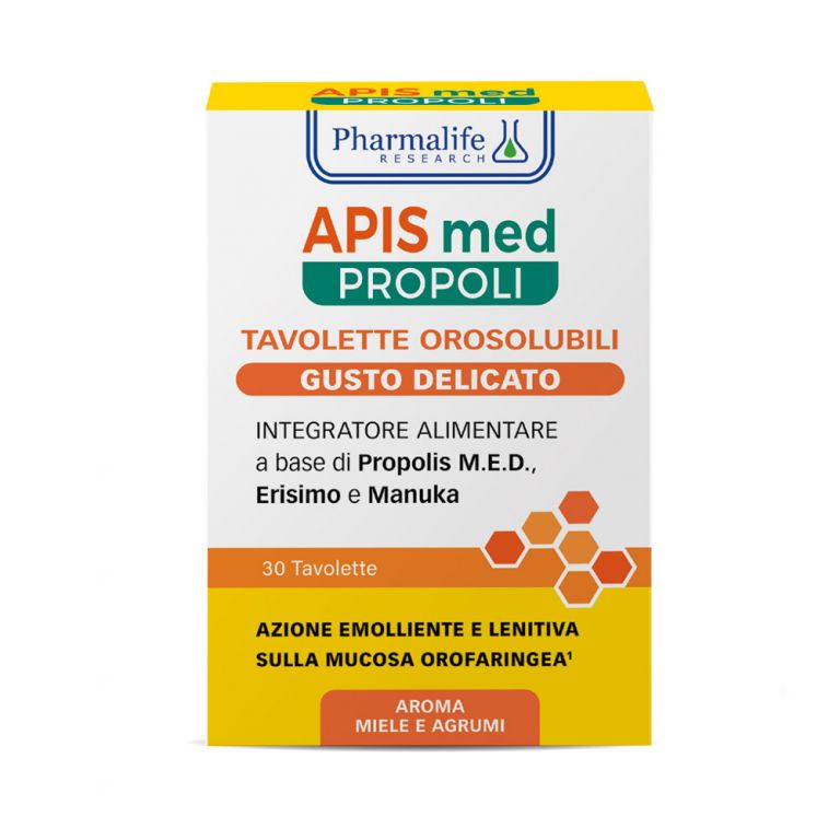 Apis Med Propoli Tavolette Orosolubili Gusto Delicato è un integratore alimentare in compresse da sciogliere in bocca contenente Propoli, Manuka ed estratti vegetali utile in caso di mal di gola e raucedine. La propoli impiegata è ottenuta tramite un processo produttivo brevettato di Multi Estrazione Dinamica, che consente di eliminare la cera e le altre impurità e di ottimizzare la standardizzazione dell’estratto nel complesso dei 6 polifenoli principali.