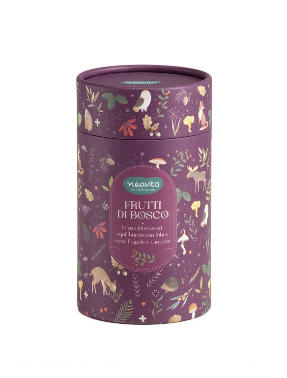 Contiene 10 filtroscrigno di FRUTTI DI BOSCO: frutti di bosco (bacche sambuco, ribes nero, lamponi, fragole), fiori di ibisco, pezzi di mela, aromi, foglie di rovo