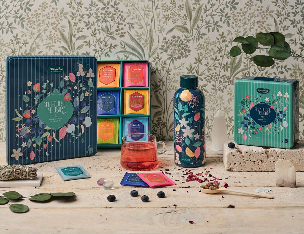 Per arricchire la tua esperienza, il cofanetto include una selezione di sei filtri di tisane biologiche Natural Elisir, con tre gusti unici: