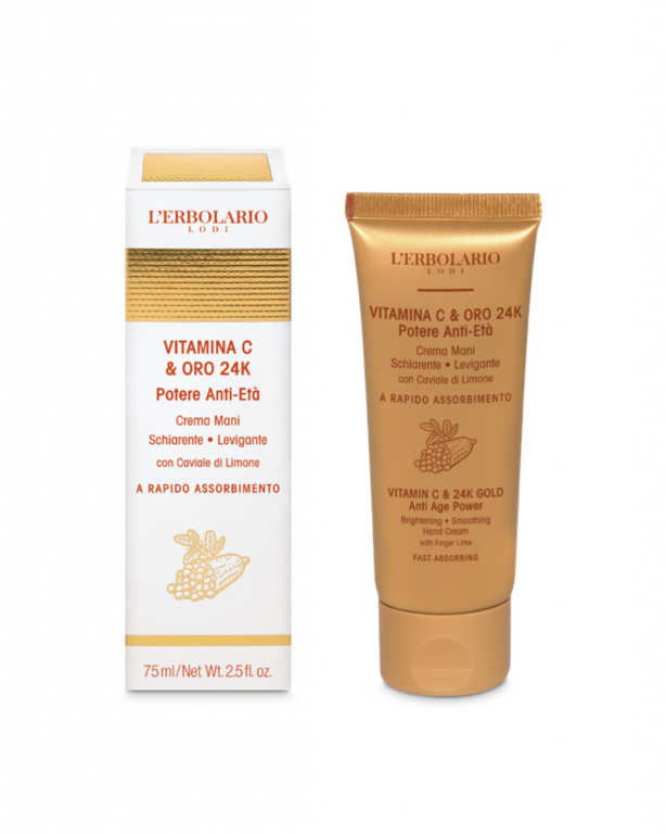 Questa Crema Mani ad azione schiarente e levigante previene e attenua visibilmente macchie e discromie e segni del tempo della pelle, combattendo l’iperpigmentazione grazie all’estratto di Melograno e Limone. Vitamina C e Oro 24k, Caviale di Limone ed estratto di Lime offrono un effetto anti-age e levigante. La texture ricca ma leggera di questa Crema Mani si fonde rapidamente sulla pelle, lasciando mani morbide e lisce.