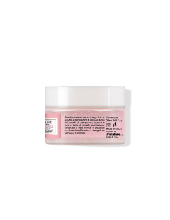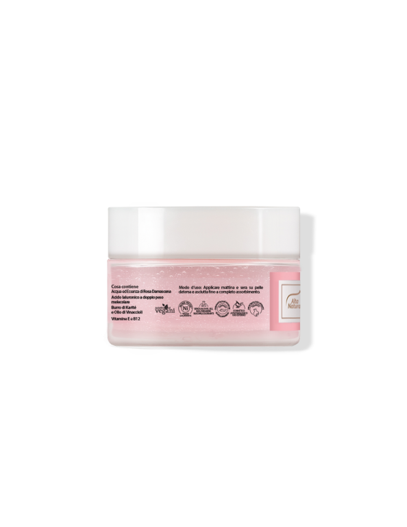 La sua formula, arricchita con Acqua di Rosa Damascena, dona un'immediata sensazione di freschezza e vitalità, mentre la combinazione di acidi ialuronici a basso e medio peso molecolare aiuta a mantenere la pelle elastica e rimpolpata.